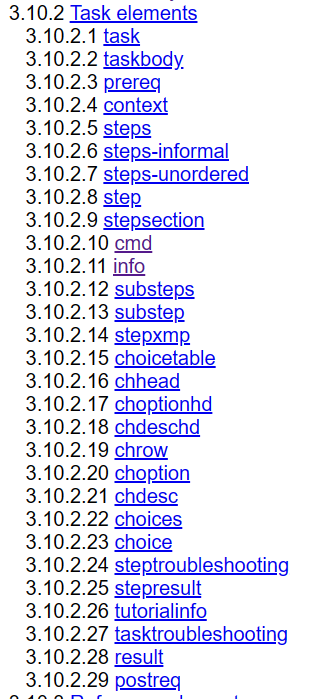 http://docs.oasis-open.org/dita/dita/v1.3/errata02/os/complete/part2-tech-content/dita-v1.3-errata02-os-part2-tech-content-complete.html#userid这里是dita标记对,一般的嵌套可以参照它的目录来,比如task类型的topic里面有什么,怎么嵌套标记对: