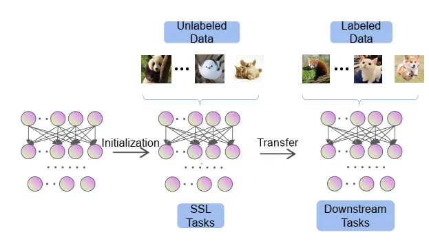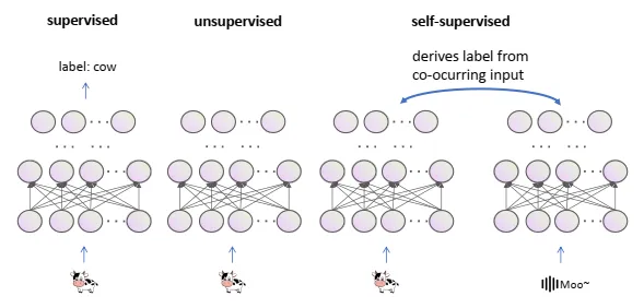 SSL最早在1994年文献3中定义,SSL的定义如下图,在这个图中,可以看到这里的SSL和无监督是有差别的,严格意义上其实是的,和无监督是不一样的,在SSL虽然没有直接的标签,但是可以有间接的标签将任务进行定义或者说是pretext task。在2020年ICLR2020 keynots,Yann Lecun将SSL定义为,对丢失信息的完善重建过程。主要包括四个方面,1. 从任意其它part预测任意part。2. 从历史预测未来。3. 从可见预测不可见。4. 从所有可用部分预测任意遮挡、马克、或者被污染部分。总之,在SSL中,输入的一部分是未知的,而目标函数就是预测这个特殊的部分。