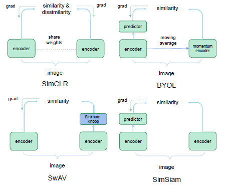 很多SSL方法都是基于CL提出的,单纯基于简单的实例区分任务进行CL学习。典型的方法比如MoCo v1, MoCo v2, SimCLR v1, SimCLR v2. 负样本对比学习是指来自同一实例样本的数据都是正样本,不同实例的数据是负样本,比如moco系列的方法是基于这个思路。另外,还有一种思路是自蒸馏的对比学习,典型的代表方法有BYOL(Bootstrap your own latent). 这种方法不需要负样本,通常使用的对比网络有两个分支,但是这两个分支不共享参数,其中一个在线网络,另外一个是目标网络。SimCLR, BYOL, SwAV这些都是这类方法。这些模型的目的是最大化来自同一张图的数据增广样本的相似度。SimSiam通过大样本以及动量解码器实现无负样本学习