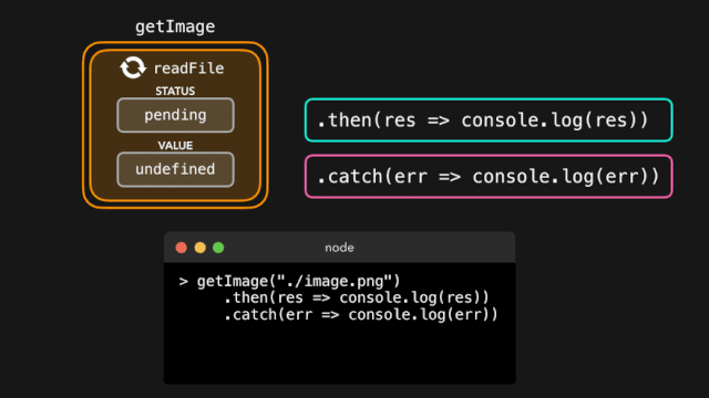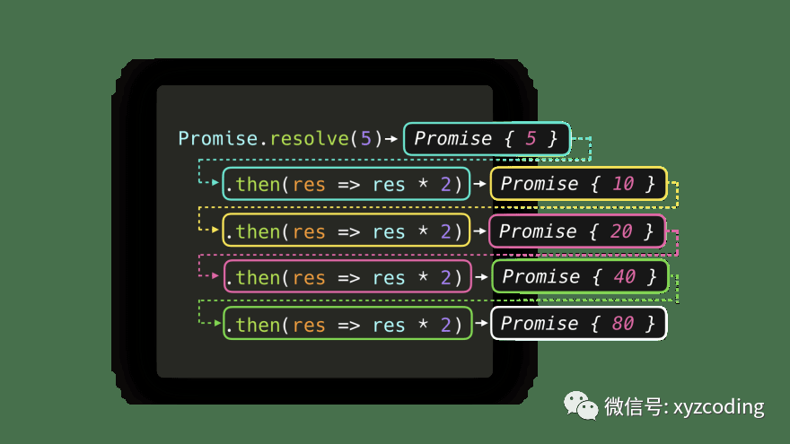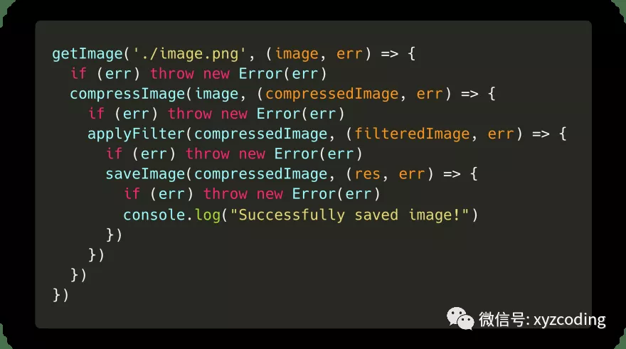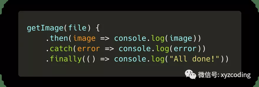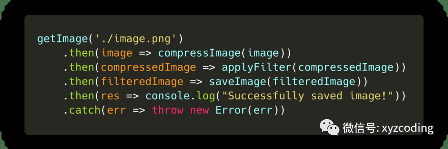 因此在getImage示例中,我们可以链式调用多个then方法,把处理过的image对象传入到下一个回调。这样我们就彻底甩脱了回调地狱,得到一个整洁的链式回调。
