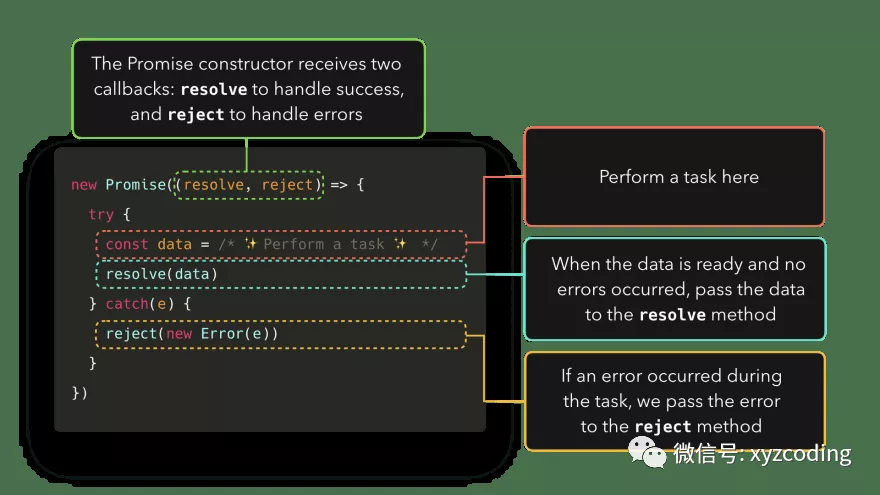 在上面示例中,我们只是简单的传递了一个回调函数给Promise的构造器,但是实际上这个回调函数接受两个参数,第一个参数我们称为resolve或者简称res,这个方法是当这个promise应该被resolve时候调用,第二个参数我们称为reject或者简称rej,这个方法是当这个promise应该被reject时候调用,意味着程序出错了。