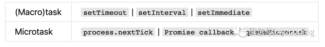 那么什么是宏任务队列,什么是微任务队列?虽然实际上存在的比我下面列出来的多,但是在下面的表格中都是我们最常见的!