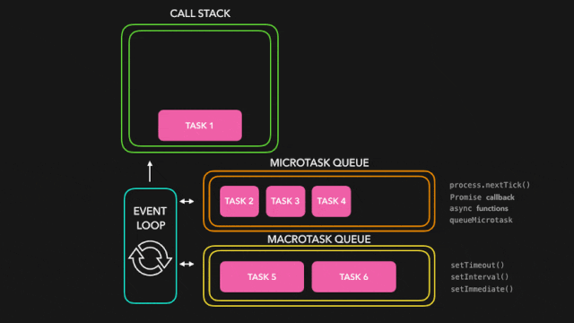 • Task2, Task3, Task4: microtasks, 比如像promise的then方法回调, 或者其他添加到microtasks的任务。