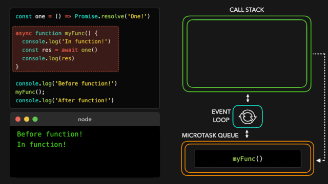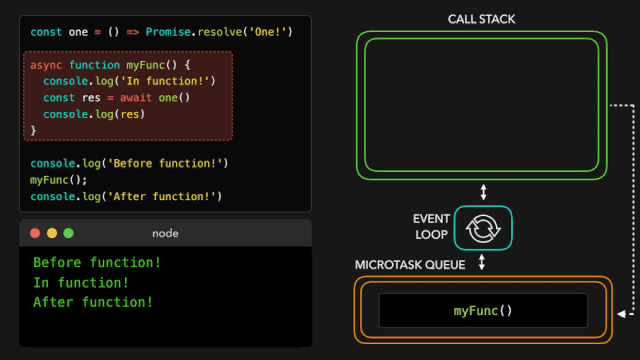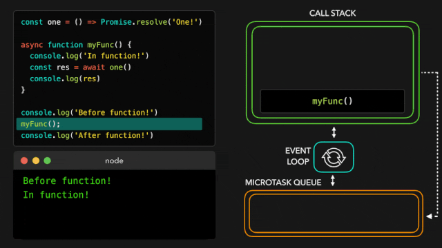 最后,没有其他任务在全局执行上下文中运行!事件循环继续检查,看看是否有任务在microtasks中排队:结果发现有异步 函数myFunc。于是myFunc弹入调用堆栈,执行,打印结果one到控制台,弹出堆栈。