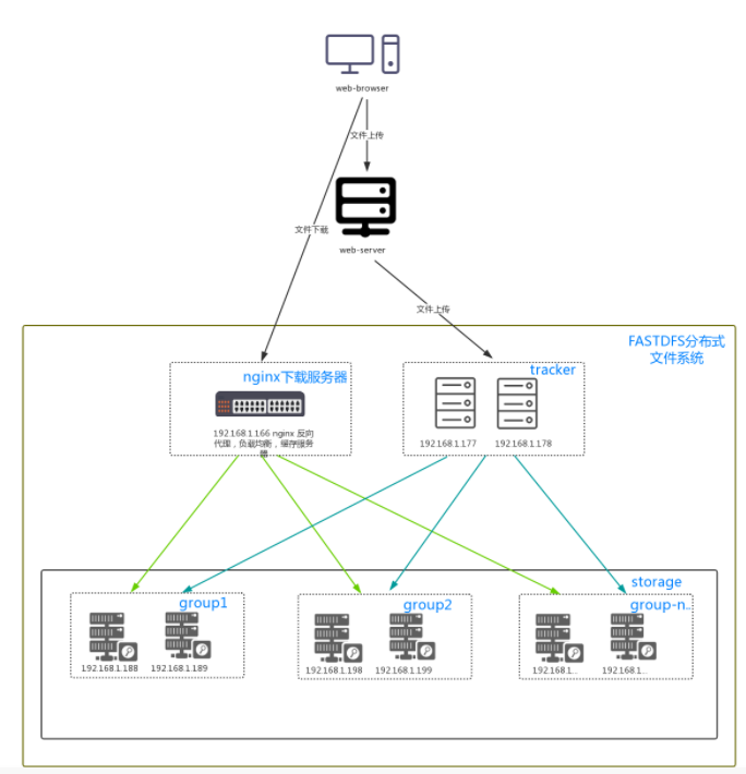 Storage Server:存储服务器,主要提供容量和备份服务;以 group 为单位,每个 group 内可以有多台 storage server,数据互为备份。Storage server没有实现自己的文件系统而是利用操作系统 的文件系统来管理文件。