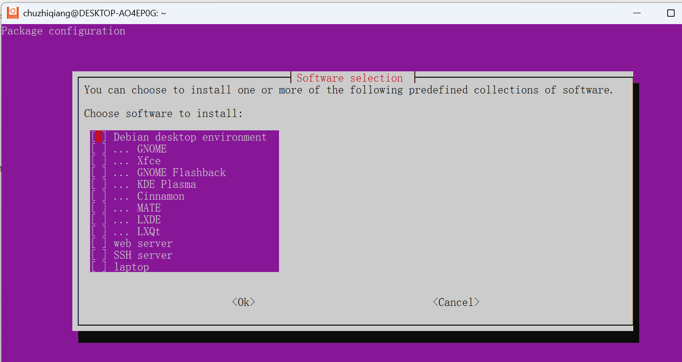 Here, we will select GNOME, to do that use the keyboard arrows to navigate and press space to select, then, press TAB to move to OK and press enter.