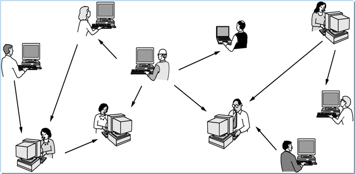 - 对等模式:组成一个一个松散群体中的个人可以与群体中的其他人通信