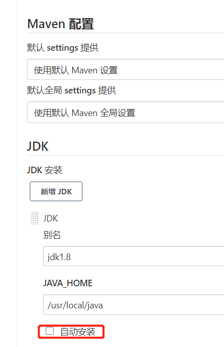 1. 因为在后台系统已经安装了JDK,所以记得将自动安装的勾选取消掉,别名需要基本的提示性,JAVA_HOME就是后台安装的路径。