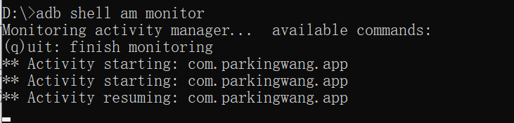1、adb shell am monitor (如果之前没退出,要先exit,monitor是监听器)
