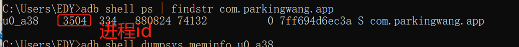 adb shell ps | findstr 包名 (要先进行一步获取包名。findstr是Windows的过滤)