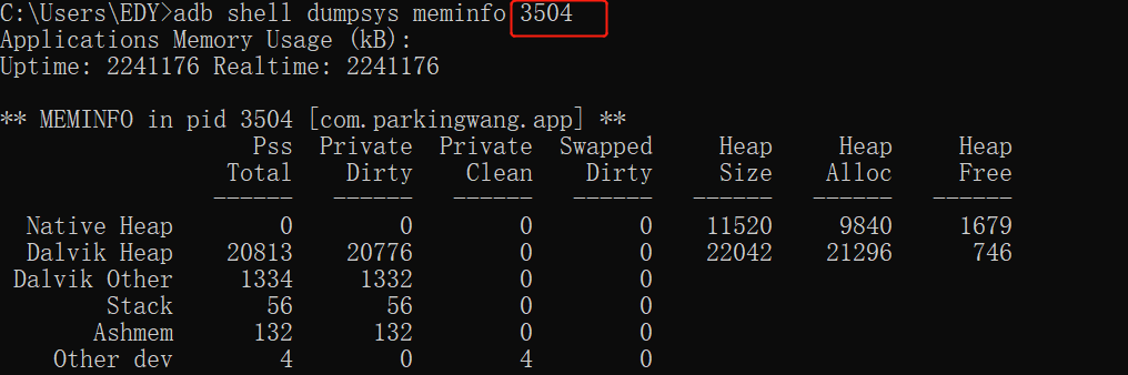 “adb shell dumpsys meminfo 进程id” (要先查看进程id)