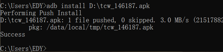 如:adb install D:\tcw_146187.apk(比如d目录下放的 tcw_146187.apk这个程序)