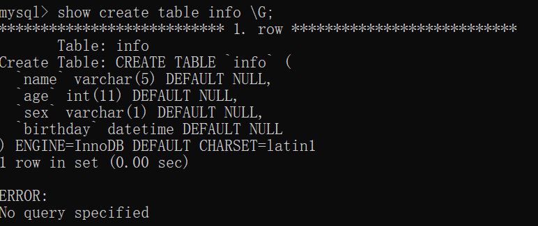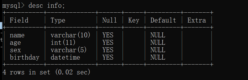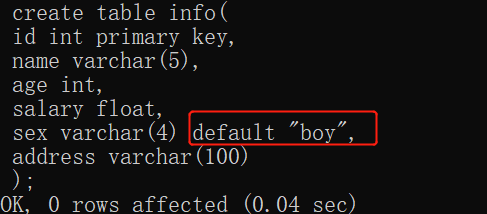 表中的id属性是不能为空,我们在下面只给id字段插入数据,其他字段就默认为空,但是除了我们刚才设置默认值的boy。