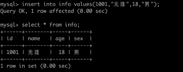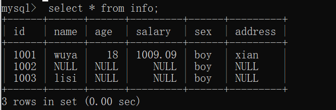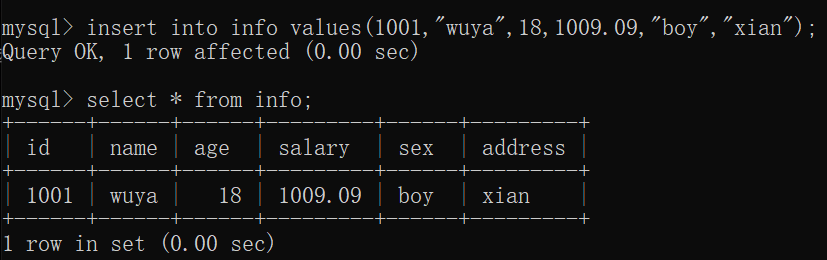 insert into 表名 values(1001,“wuya”,18,1009.09,“boy”,“xian”);