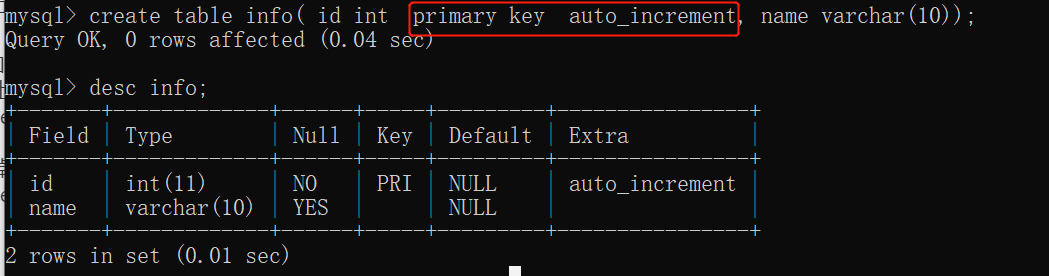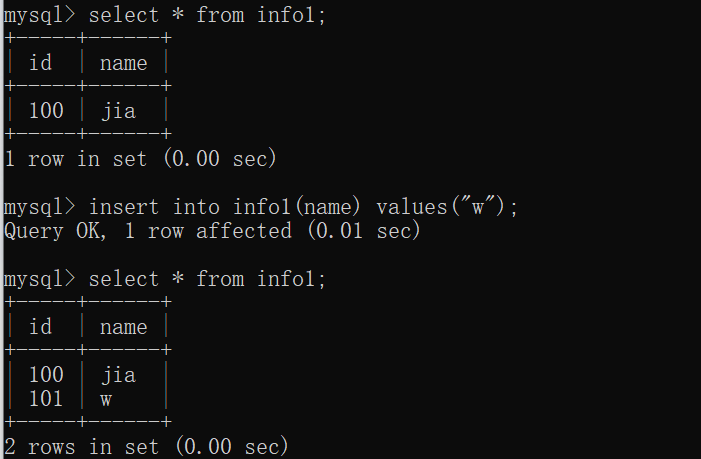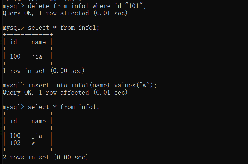 例如:给了id主键递增属性,现在有一行数据id为100,再插入一个姓名为“w”的数据,默认id递增为101.