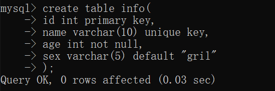 创表:把id设置成主键,姓名设置唯一约束性,年龄不能为空,default默认值是女孩: