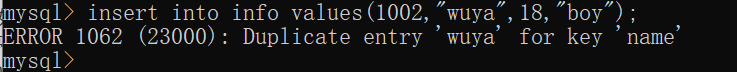 已经有一条姓名为wuya的信息,再插入一条叫wuya的,就会报错: