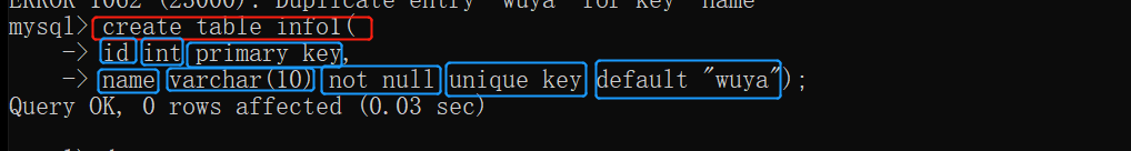 (创建表info1,id设置主键,姓名不能为空、唯一约束性、默认值为wuya)