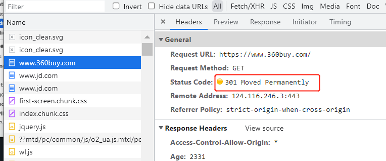 如在空白标签页进入www.360buy.com会跳转到京东,并且状态码显示为301(就说明此域名被永久重定向到京东的首页了),这种情况与开发确认即可。