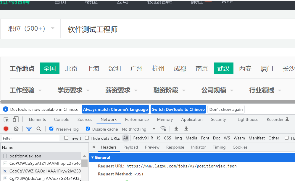 如:在拉钩网搜索职位,在postman中发送请求获取本页的信息: