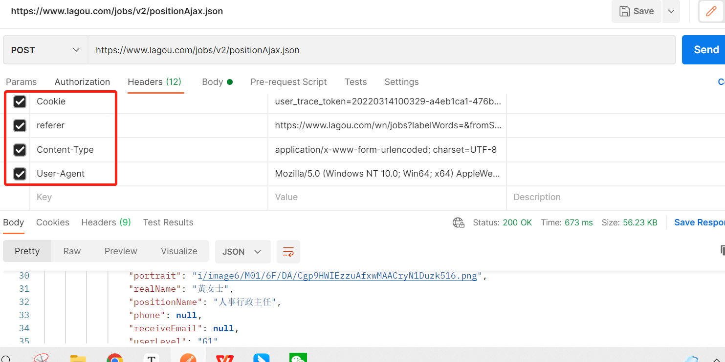 需要在postman的Headers中输在拉勾网获取的cookie、referer、content-type、user-agent和Body中输在拉勾网获取的Payload请求参数。