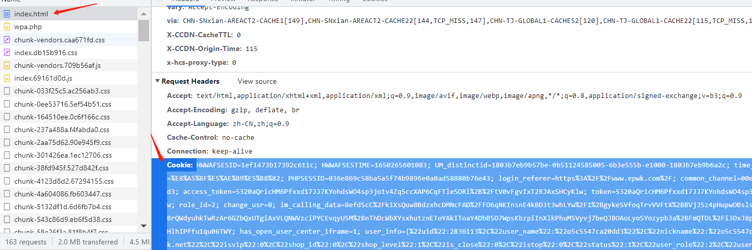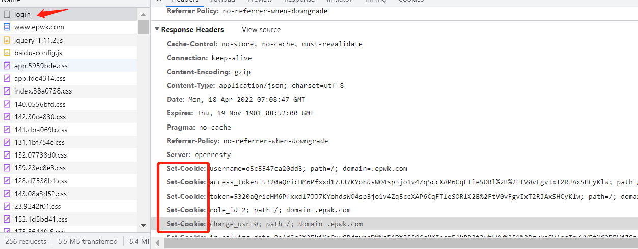 2、登录成功后,捕捉到login,其中的响应头会有一些Set-Cookie(复制出来)