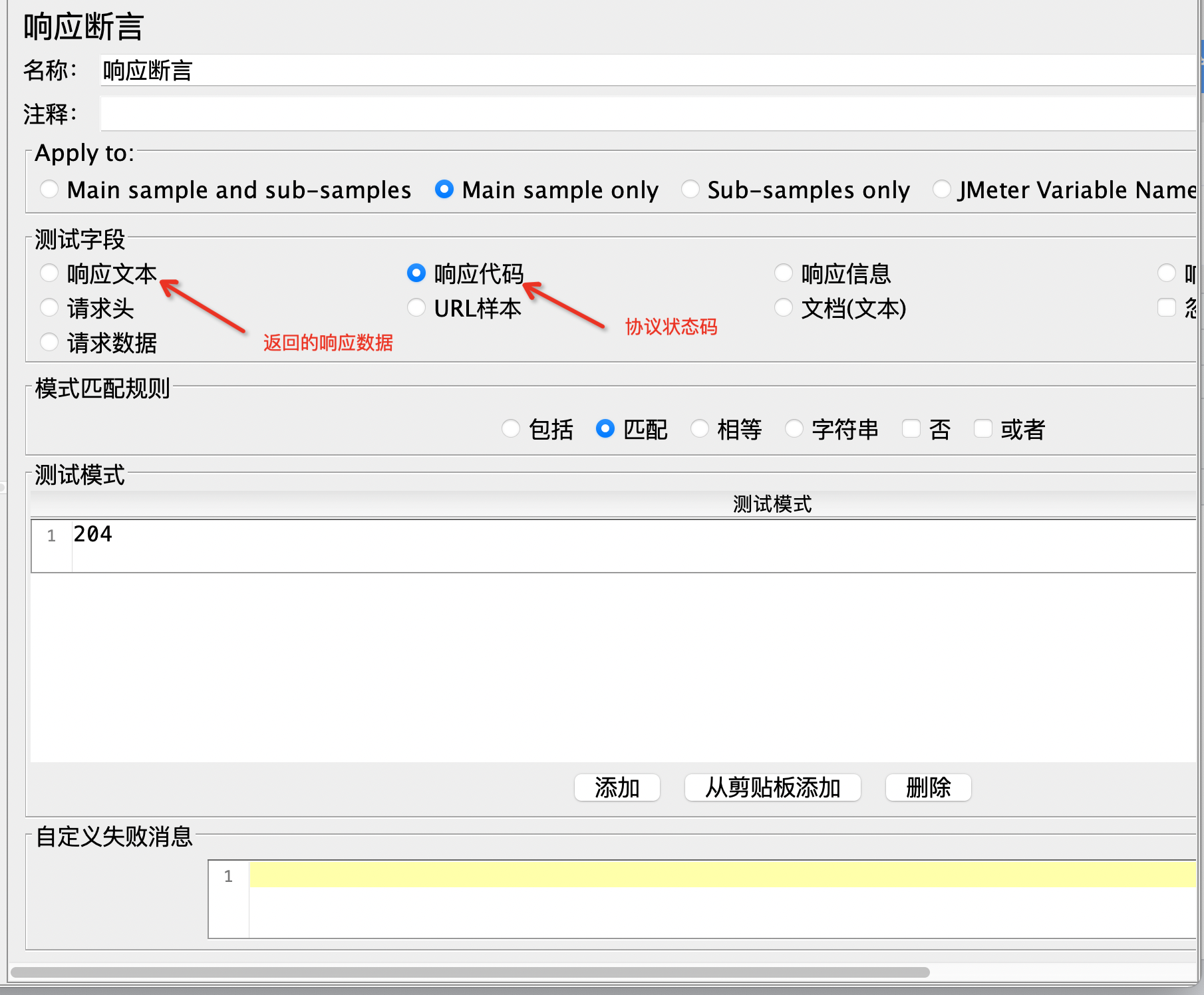 响应断言主要用于验证响应数据和协议状态码(所以断言主要是用两种:响应断言和前面学到的json断言)