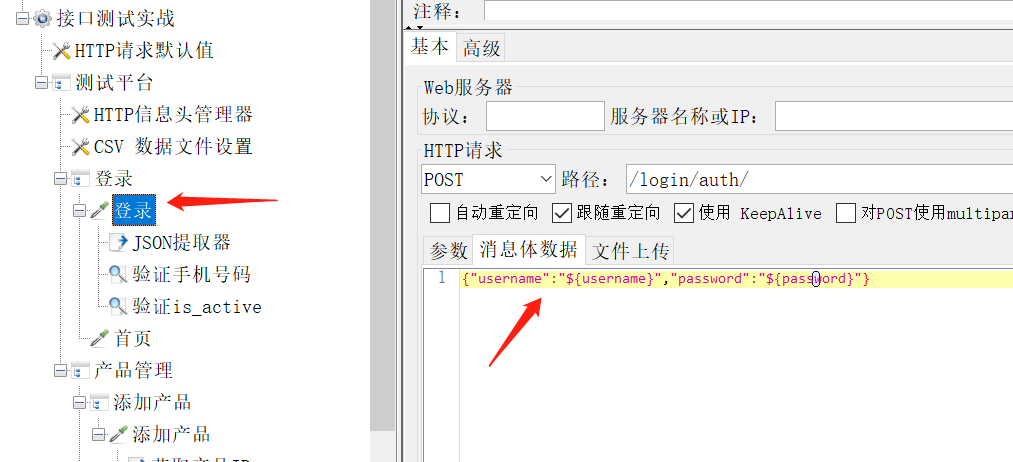 在测试用例中,比如请求参数和断言的位置,如果需要 也要调用变量,例如在登录请求中的请求参数中使用${} 调用直接调用我们在txt中的数据,