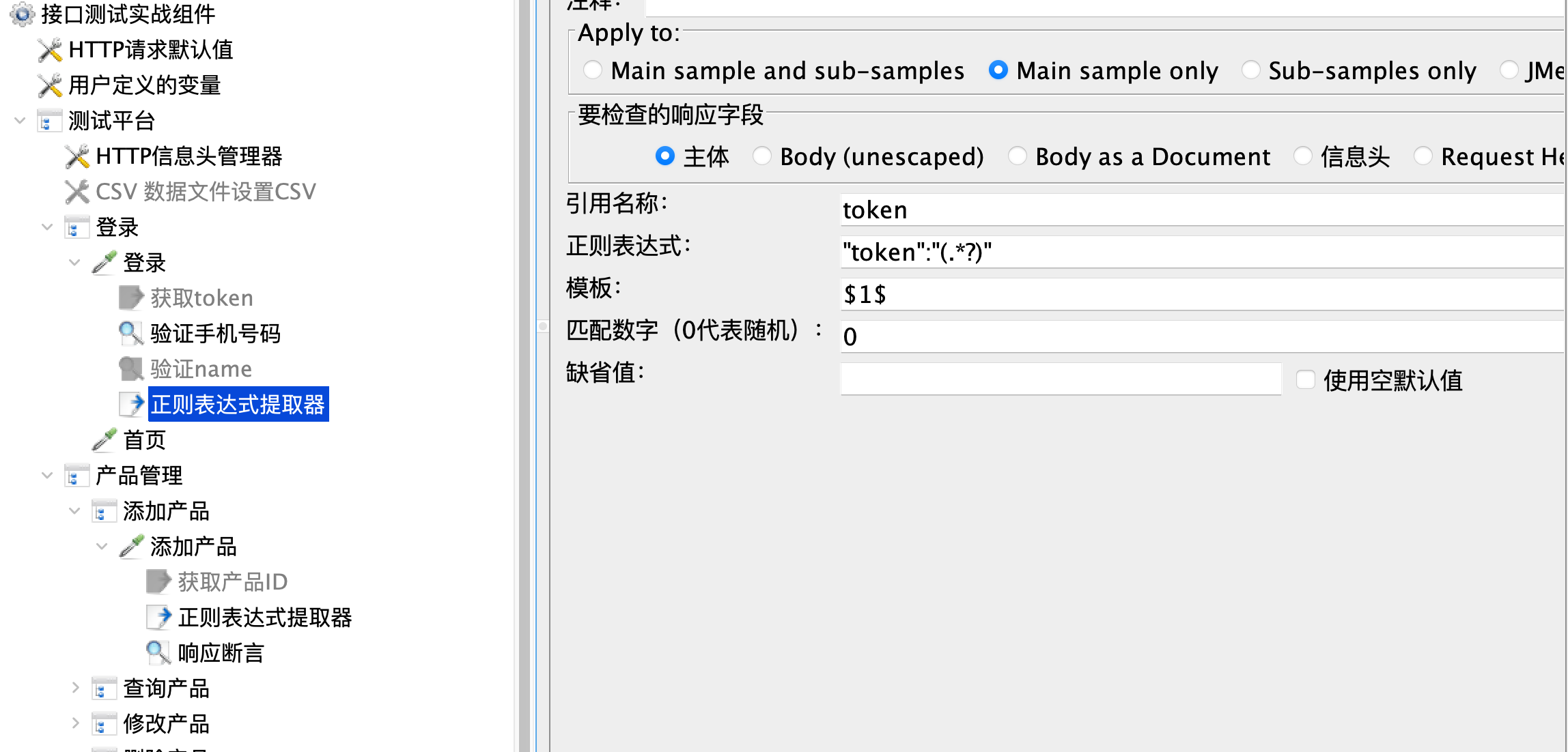 在登录接口中,通过正则表达式提取器提取token: