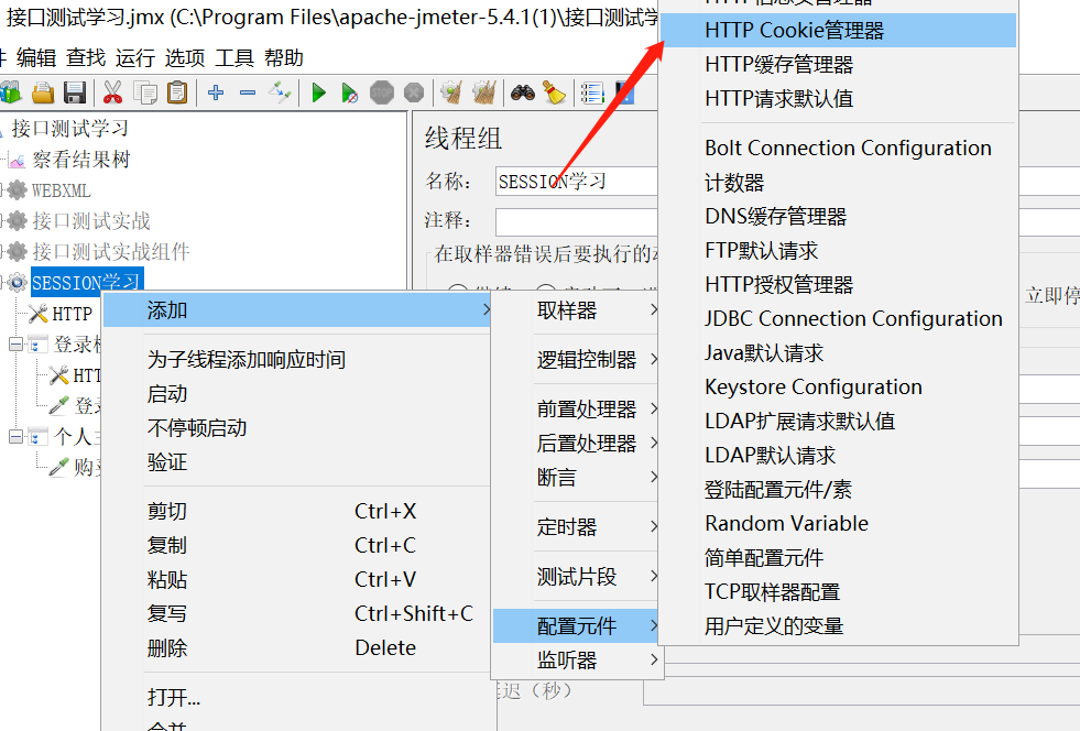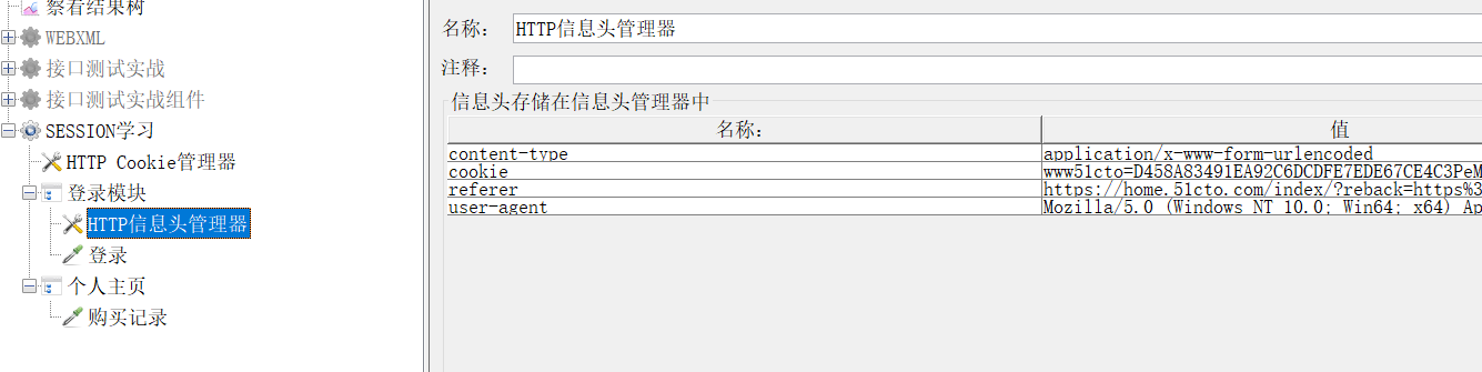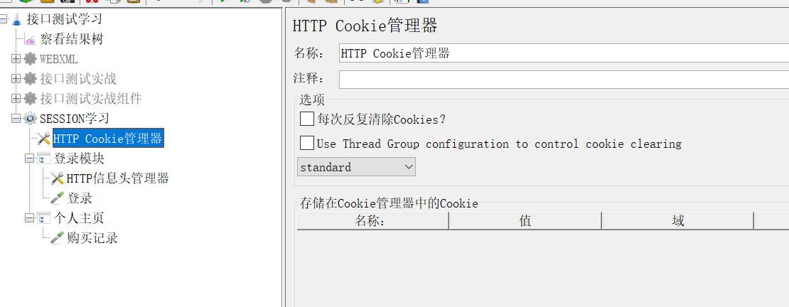 HTTP COOKIE管理器的作用是:在所有的请求中共享SESSIONID(可以使用JSON提取器获取token也可以使用这种方式,这种方式更简单粗暴,但是值可能会过期)
