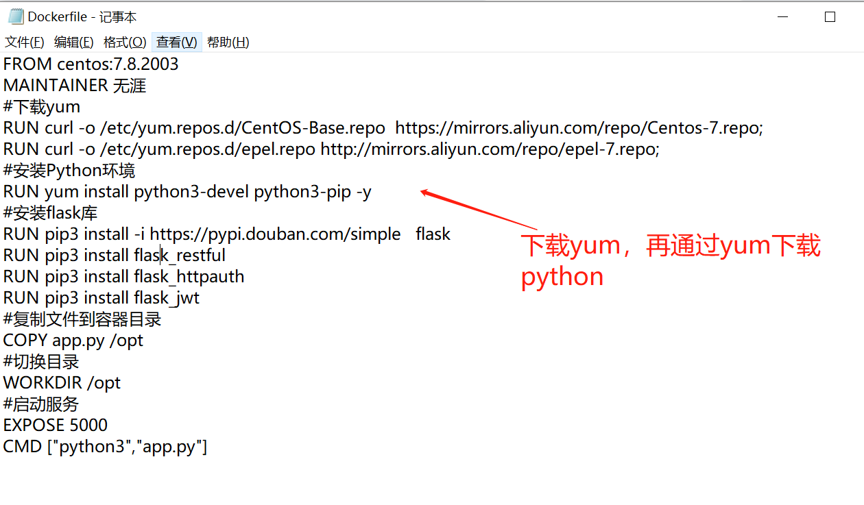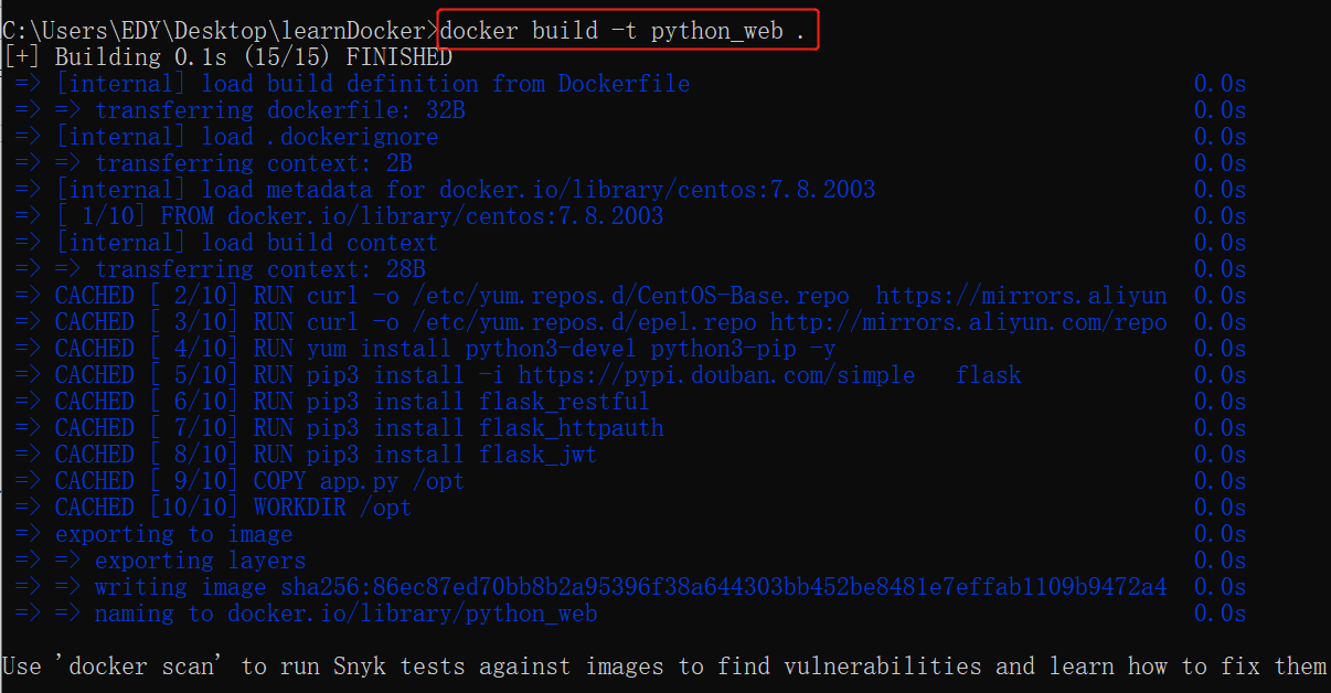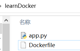 把app.py文件和Dockerfile文件放在同一目录下(这里 我们放在learnDocker下),并且py文件名必须是app.py(因为这个文件名在Dockerfile文件中已经写死了,并且每当.py文件变化一次 就要重新构建一次镜像)