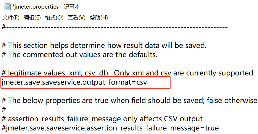 (2) ctrl +f ,搜索jmeter.save.saveservice.output_format,取消井号 并且 把等号后的xml改为csv,点击保存