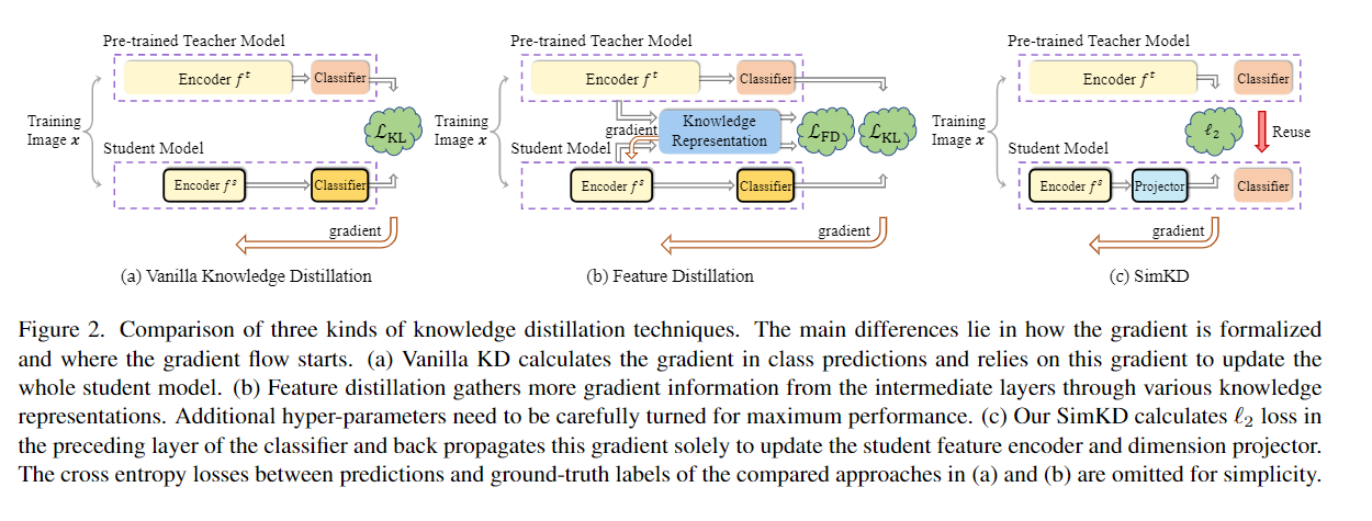 SimKD 的一个关键组成部分是“分类器重用”操作,即我们直接借用预训练的教师分类器进行学生推理,而不是利用教师网络的soft target去训练一个新的分类器。这消除了标签信息计算交叉熵损失的需要,并使特征对齐损失成为生成梯度的唯一来源。