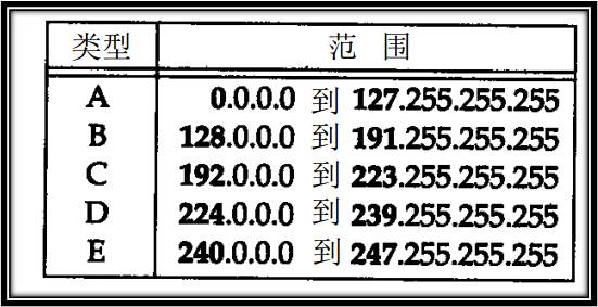 E类:是保留地址。该类IP地址的最前面为“1111”,所以地址的网络号取值于240~255之间。