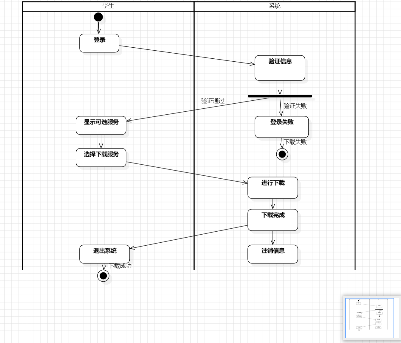 某“远程网络教学系统”下的“学生下载课件”用例,其流程为: 学生下载课件前需要先登录:在登录时,系统需要验证用户的登录信息:如果验证通过,系统会显示所有可选服务;如果验证失败,则学生登录失败。 当学生看到系统显示的所有可选服务后,选择下载服务,然后下载需要的课件。 下载完成后,学生退出系统,系统则会注销相应的学生信息。画出此用例的活动图(带泳道)。