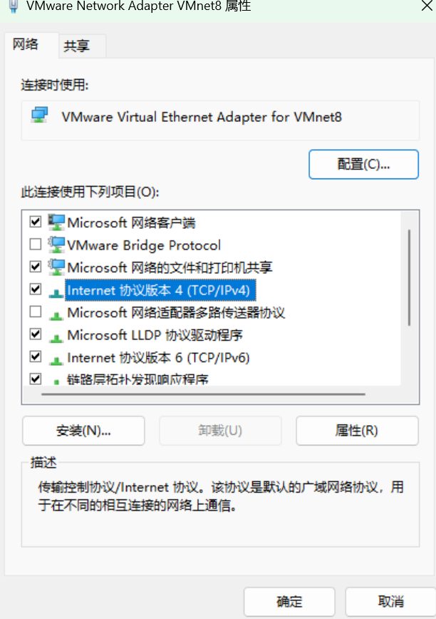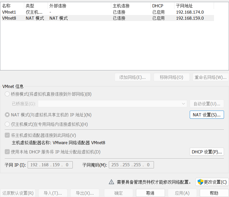 三、打开虚拟网络编辑器---VMnet8选择NAT模式---注意勾选下方,同时修改NAT设置和DHCP设置中确保网关和IP在同一个网段下