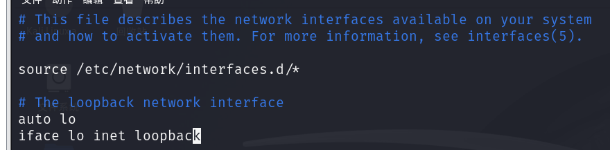 进入kali终端---sudo su 获取管理员权限--- 打开网络接口配置文件