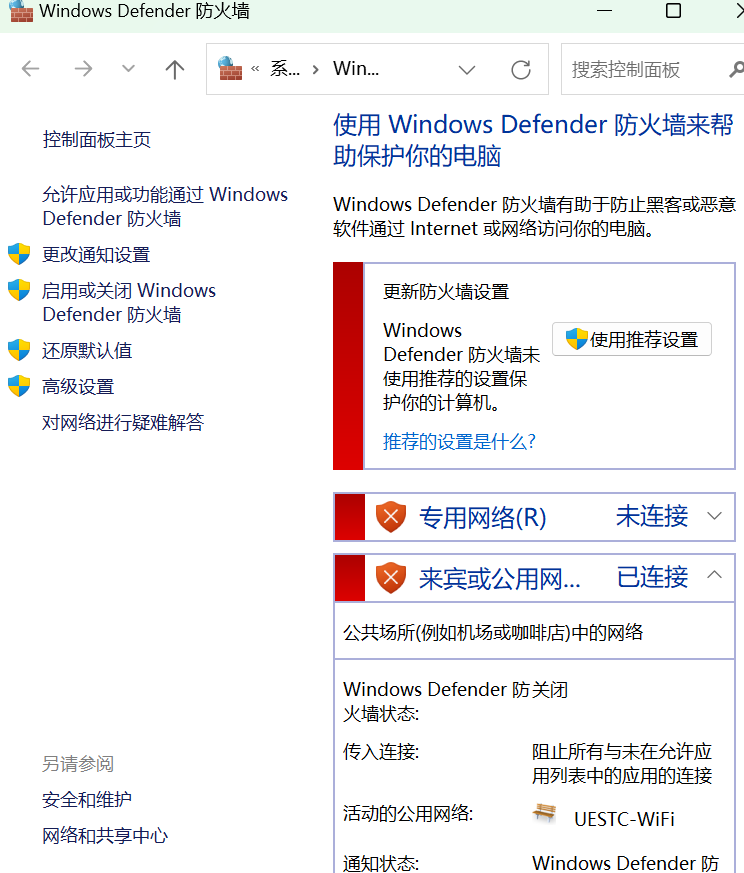 打开Windows Defender防火墙 --- 启用或关闭Windows Defender防火墙 --- 关闭