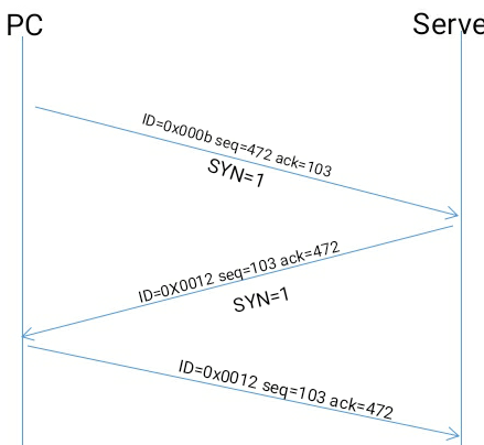 第一次握手:pc机向服务器发出连接请求报文段,此时SYN=1,初始序号seq=0。