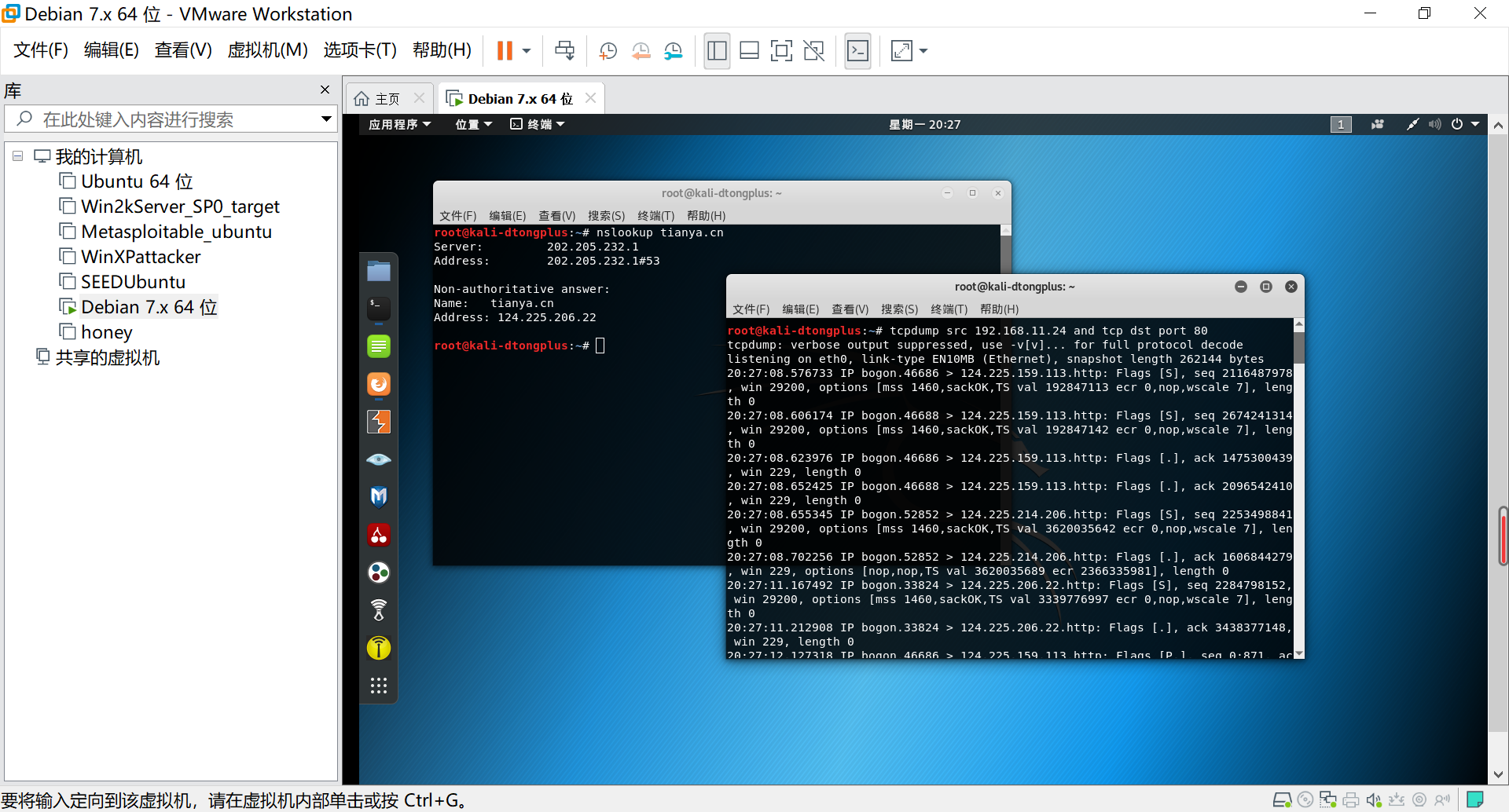 i.在kali虚拟机上终端输入tcpdump src (本机IP)192.168.11.24 and tcp dst port 80。然后打开火狐浏览器访问 www.tianya.cn。我们可发现tcpdump 嗅探到的数据包如下: