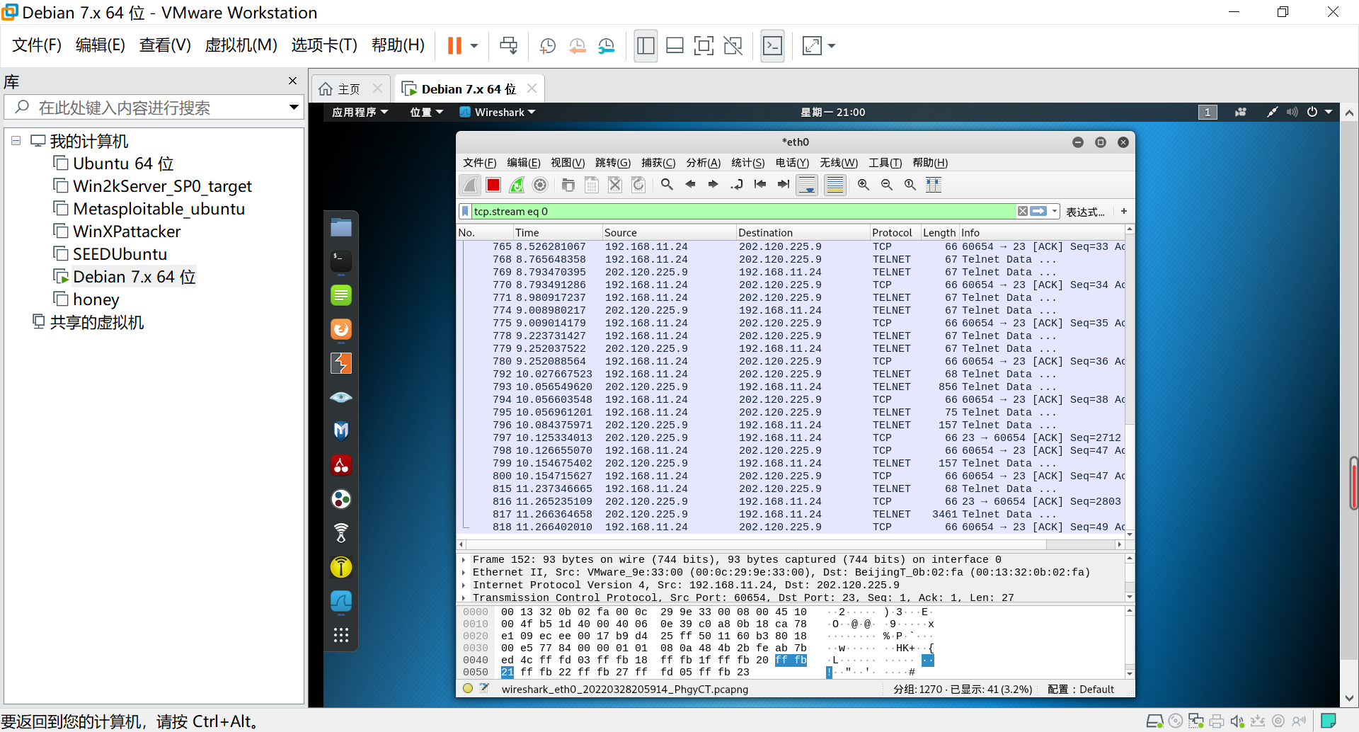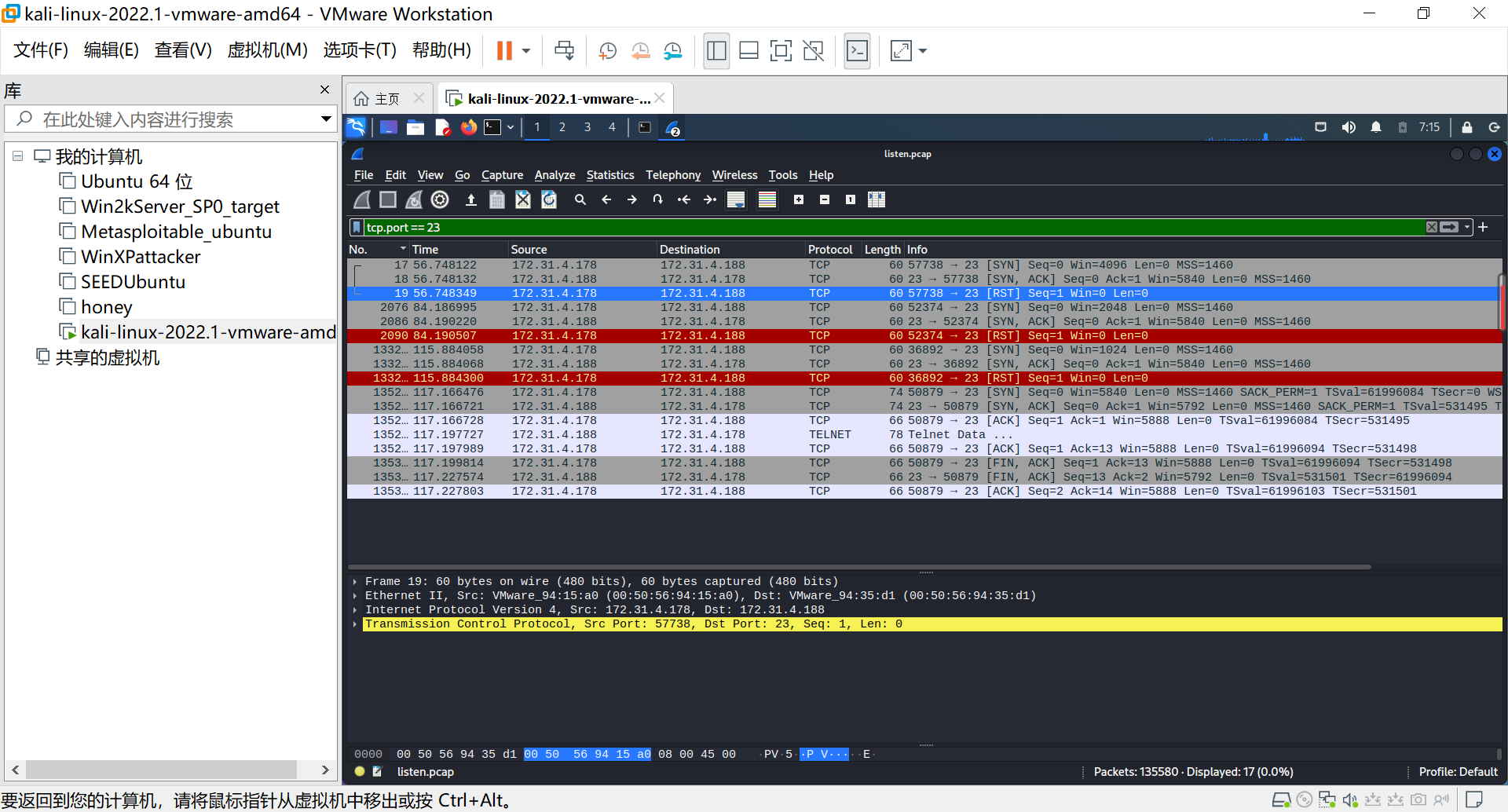 使用命令tcp.port == 23(23为telnet端口)过滤文件数据。发现攻击机对靶机进行4次扫描过程。可以看出在第一二三次扫描都只是建立了连接就结束了,但在第四次扫描的时候出现了telnet连接;