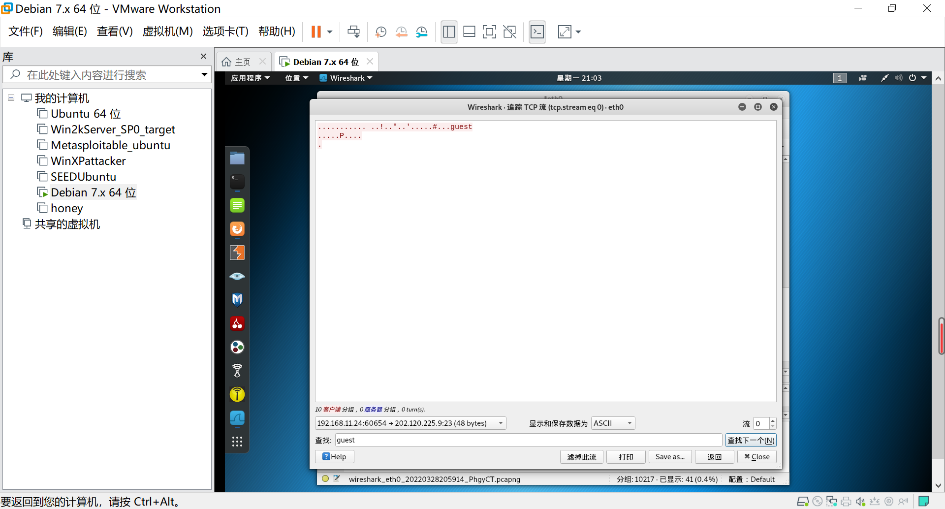 iii.Telnet协议在传输用户名和密码时采用的时明文传输,我们通过追踪TCP流可以看到我们的用户名为guest。如下所示:
