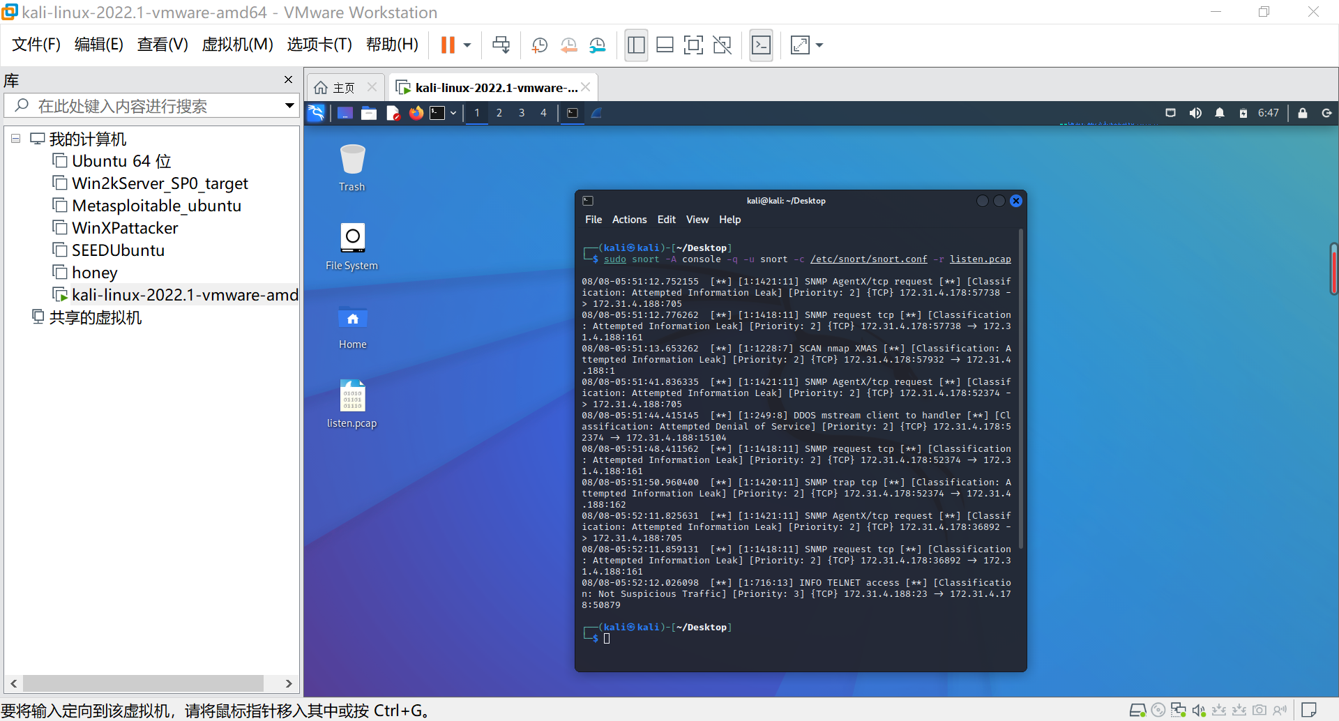i.使用snort对二进制记录文件进行入侵检测。