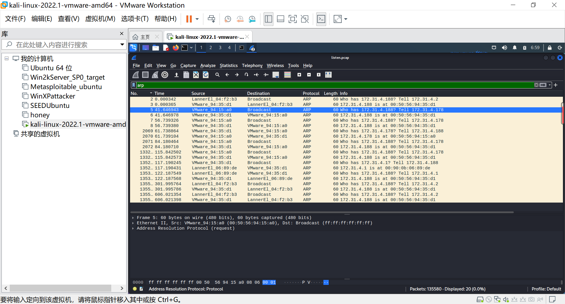 在wireshark中筛选ARP。nmap每次探测主机活跃都是在广播域内广播arp request报文,而且每次扫描之前都会进行主机活跃探测。