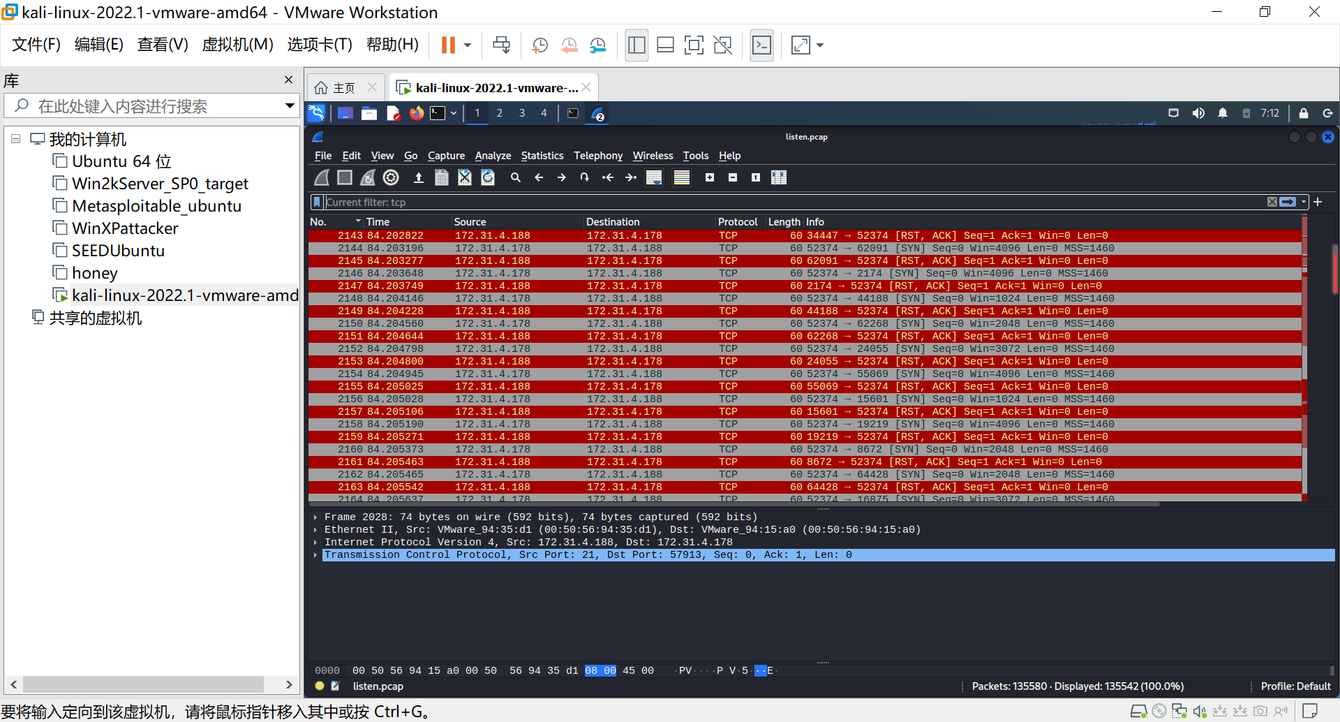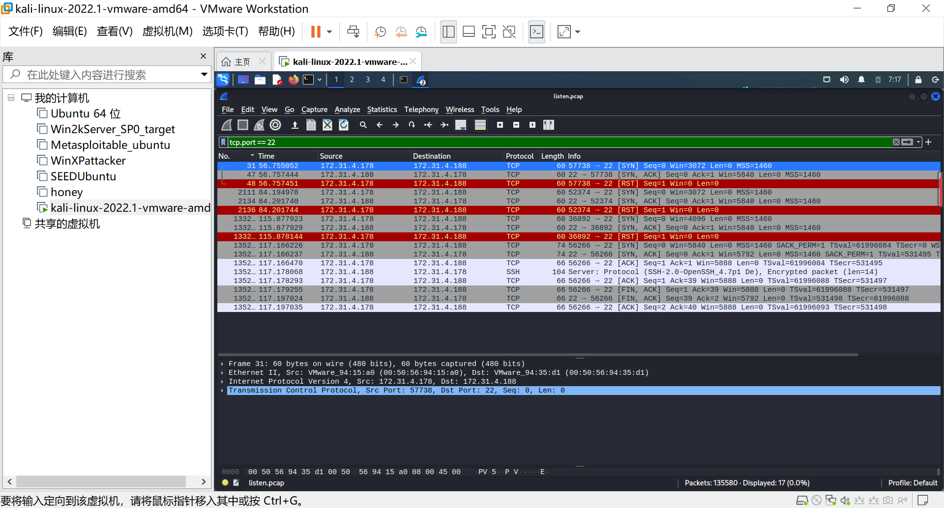 通过snort的分析,我们可以得到攻击主机IP为172.31.4.178,网络扫描目标IP为172.31.4.188。