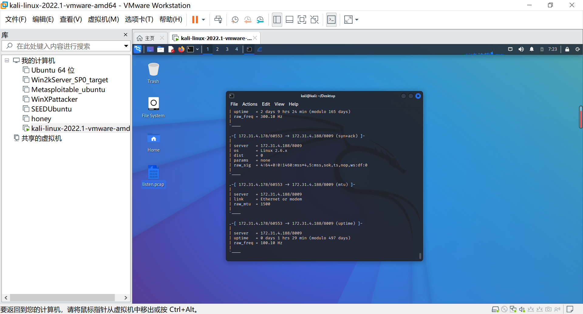 iv.然后确定操作系统,使用p0f -r listen.pcap对数据包进行分析,可以从中发现探测到的操作系统版本为Linux 2.6.x:结果如下: