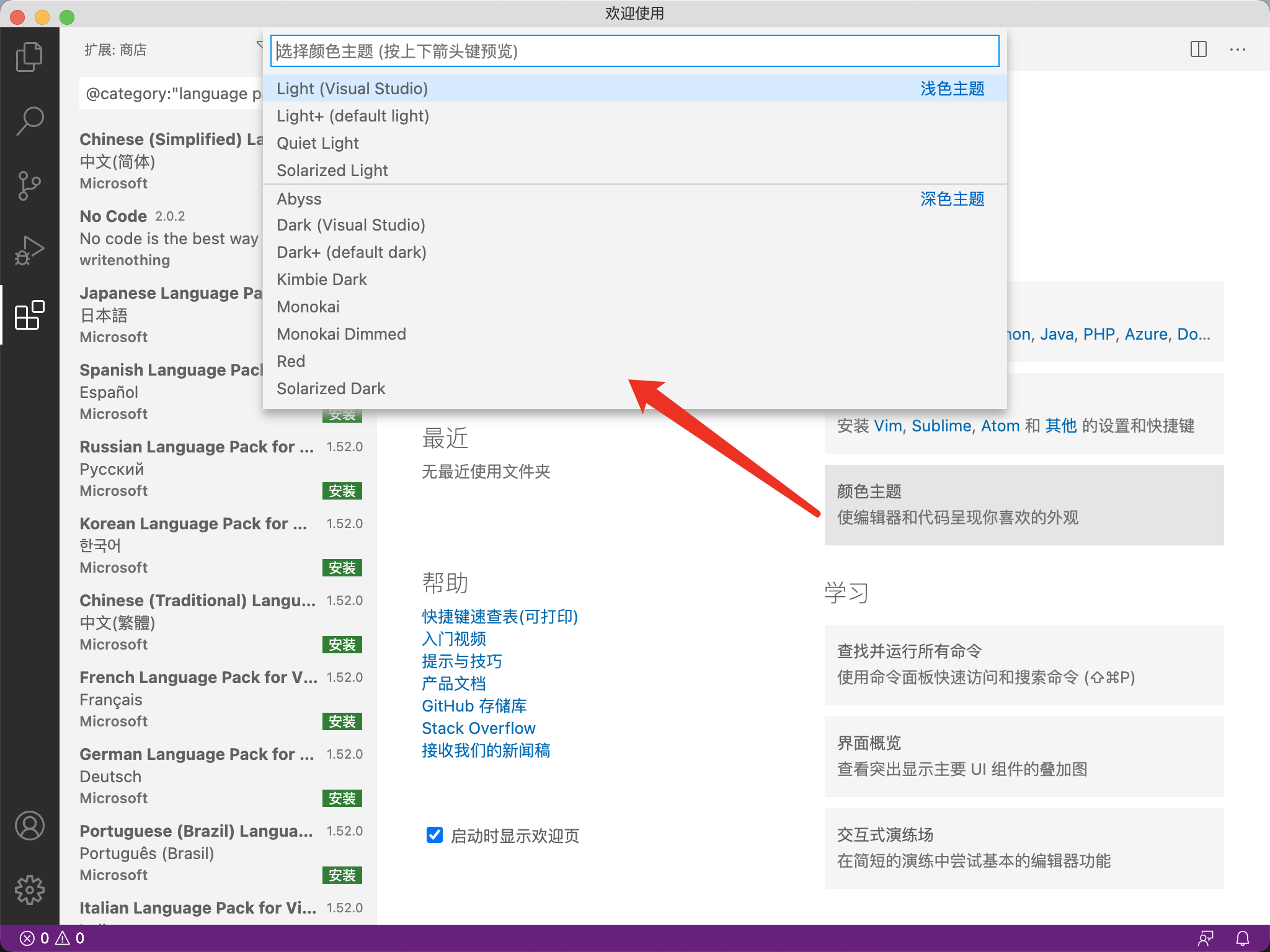 在欢迎使用界面里,点一下颜色主题,就可以配了。选择你自已喜欢的主题。