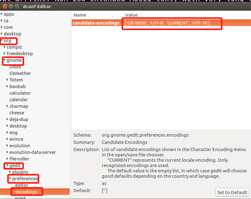 命令dconf-editor,现在改完以后是['GB18030', 'UTF-8', 'CURRENT', 'UTF-16']