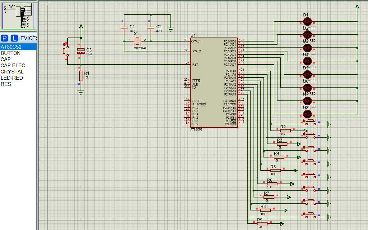 /* Main.c file generated by New Project wizard * * Created: 周四 4月 2 2020 * Processor: AT89C52 * Compiler: Keil for 8051 */ #include <reg51.h> #include <stdio.h> #include < intrins.h> void delay(void) //延迟函数,当程序输出一个电信号后,CPU做无意义运算,让这个状态维持一段时间(约0.5毫秒), //人眼就能感受到LED灯被点亮了 { unsigned int i,j; for(i=0;i<10;i++) for(j=0;j<5000;j++) { } } void main(void) { // Write your code here unsigned char a,b; signed int i; a=1; b=1; while (1) { for(i=0; i<16; i++) { P1=a;//P1在安装好的keil目录的reg51.h被定义好,是单片机P1端口(共8个)的数据寄存器, //即给它赋值就代表了让P1.0-P.7输出(1,高电平,0,低电平),以驱动外接的LED灯被点亮 P2=b; delay(); a=_crol_(a,1);//定义在intrins.h里的标准C函数,使得a无符号 字符型变量(8位二进制数)循环左移, //然后当把a赋值给P1后,使得P1口每一位(P.0-P1.7)逐次输出一个1(5v高电平) b=_crol_(b,1); } b=_cror_(b,1); for(i=0; i<15; i++)//流水灯都往右 { P1=a; P2=b; delay(); a=_crol_(a,1); b=_cror_(b,1); } for(i=0; i<15; i++)//流水灯都往左 { P1=a; P2=b; delay(); a=_cror_(a,1); b=_crol_(b,1); } a=_cror_(a,1); for(i=0; i<15; i++)//流水灯相对而行 { P1=a; P2=b; delay(); a=_cror_(a,1); b=_cror_(b,1); } for(i=0; i<16; i++) { P1=a; P2=b; delay(); a=_crol_(a,2); b=_crol_(b,2); } } }