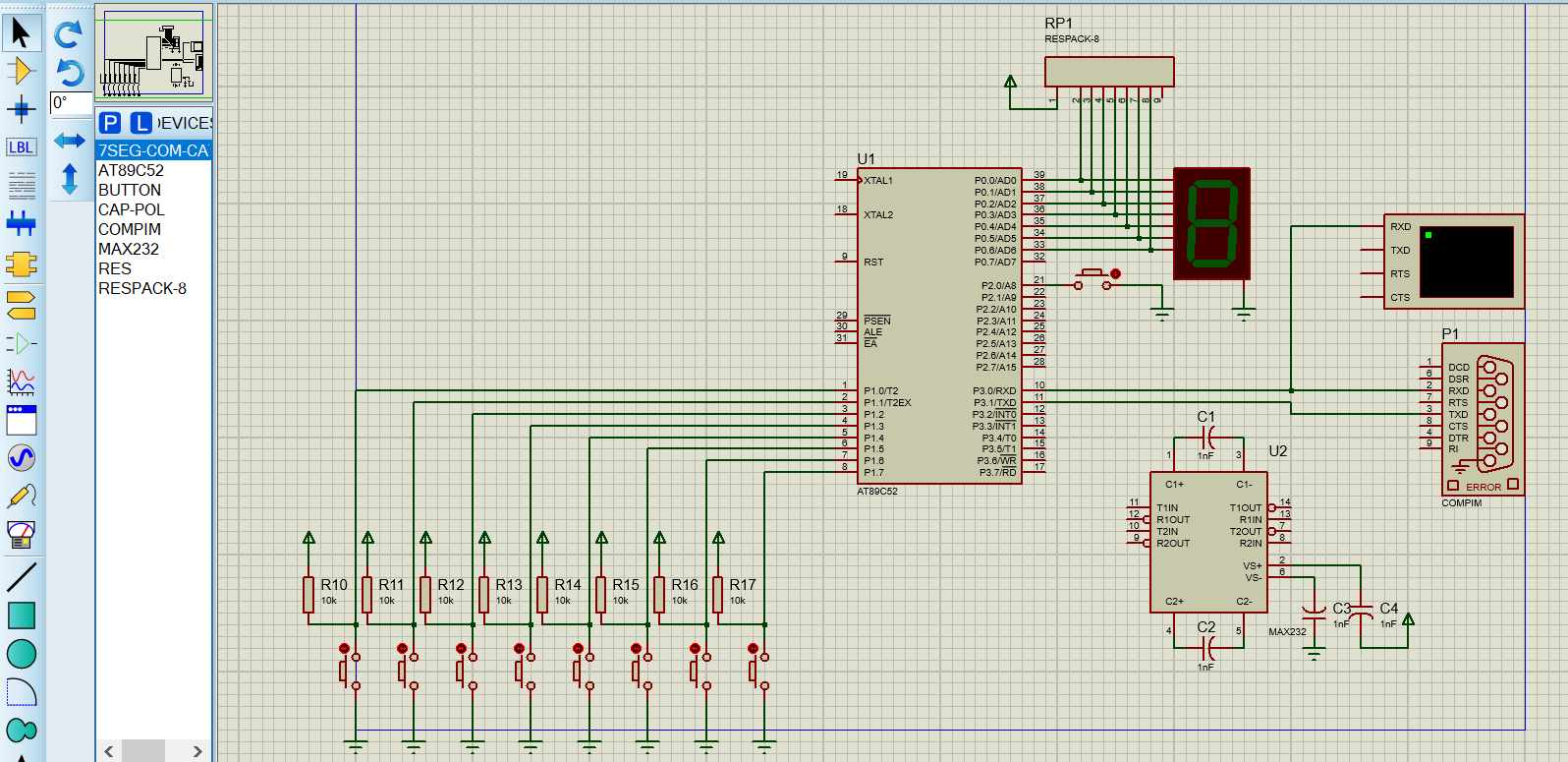 #include<reg52.h> #include <stdio.h> #define uchar unsigned char #define uint unsigned int uchar table[]={0x3f, 0x06, 0x5b, 0x4f, 0x66, 0x6d, 0x7d, 0x07, 0x7f, 0x6f}; uchar a; uchar str[7] = "Hello !"; void delay_ms(uint x) { uchar t; while(x --) for(t = 0; t < 120; t ++); } void csh() { SCON = 0x50; PCON = 0; TH1 = 0xFD; TL1 = 0xFD; TMOD = 0x20; ES = 1; EA = 1; TR1 = 1; } uint Key() { uint k; k = 0; if(P1 != 0xff) { delay_ms(10); switch(P1) { case 0xfe:k = 1; break; case 0xfd: k = 2; break; case 0xfb: k = 3; break; case 0xf7: k = 4; break; case 0xef: k = 5; break; case 0xdf: k = 6; break; case 0xbf: k = 7; break; case 0x7f: k = 8; break; } while(P1 != 0xff); } else if(P2 != 0xff) { delay_ms(10); if(P2 == 0xfe) k = 9; } return k; } void main() { uint i; csh(); P0 = 0x00; while(1) { if(TI == 0) { uint K = Key(); if(K >0 & K< 9 ) { SBUF = (K + 0x30); while(!TI); TI = 0; } else if(K ==9) for(i = 0; i < 7; i ++) { SBUF = str[i]; while(!TI); TI = 0; } } } } void intrr() interrupt 4 { if(RI == 1) { RI = 0; P0 = table[SBUF-0x30]; } }